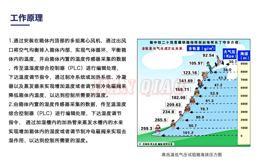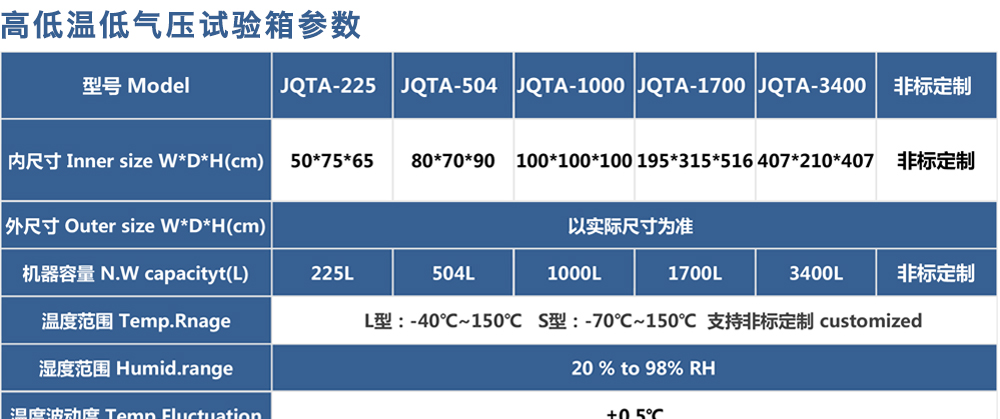 • 高空低氣壓試驗箱可以模擬高海拔、高空、(高原地區)氣候進行貯存運用、運輸可靠性試驗,并可同時對試件通電進行電氣性能參數的測試設備。適用于國防工業,航天工業自動化零組件,汽車部件,電池,平面顯示屏模組工業及相關產品料進行環境試驗 - 高溫試驗、低溫試驗、溫度變化試驗、低氣壓試驗、溫度高度試驗、低溫/低氣壓綜合試驗、高溫/低氣壓綜合試驗。