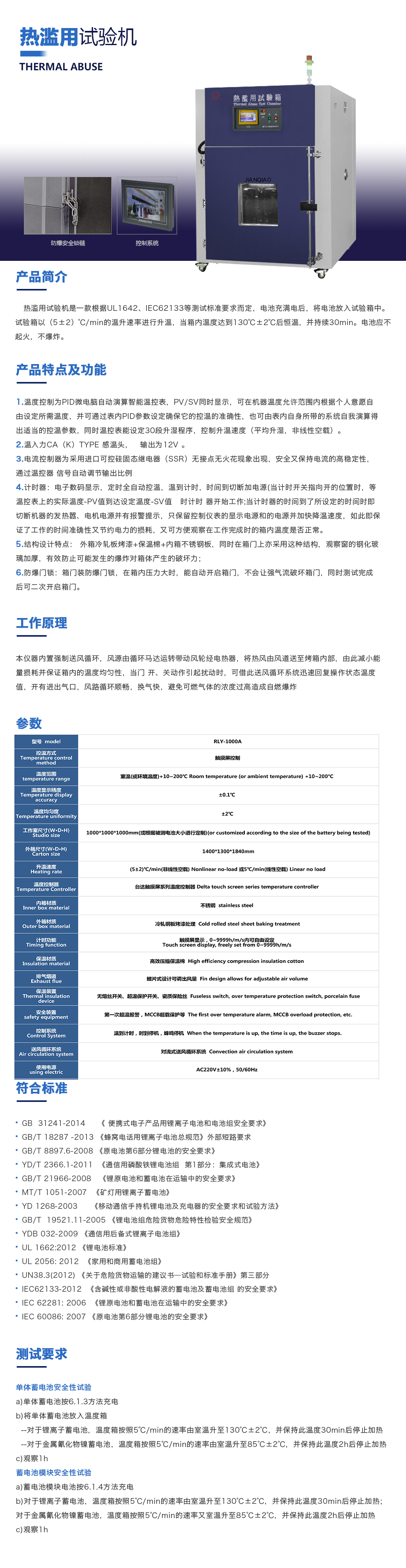 用途:熱濫用試驗箱是一款根據(jù)UL1642、IEC62133等測試標(biāo)準(zhǔn)要求而定,電池充滿電后,將電池放入試驗箱中。試驗箱以(5±2)℃/min的溫升速率進行升溫,當(dāng)箱內(nèi)溫度達到130℃±2℃后恒溫,并持續(xù)