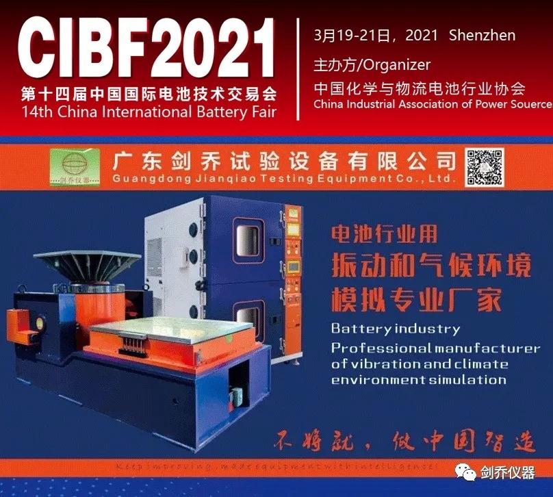 2021年3月19-21日,廣東劍喬試驗設備有限公司【劍喬儀器】將攜旗下最新試驗設備亮相2021年的第一場展會—(CIBF2021)“第十四屆中國國際電池技術交流會/展覽會”。現場展示:振動試驗系統、溫濕度振動三綜合箱、電池熱濫用試驗箱、電池短路試驗箱、高加速沖擊試驗臺、高低溫防爆試驗箱、等試驗設備及動力電池相關試驗解決方案。