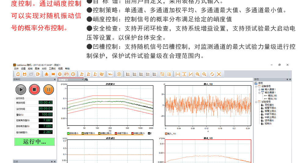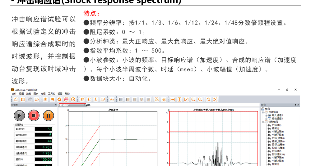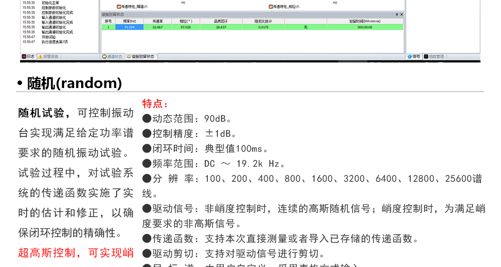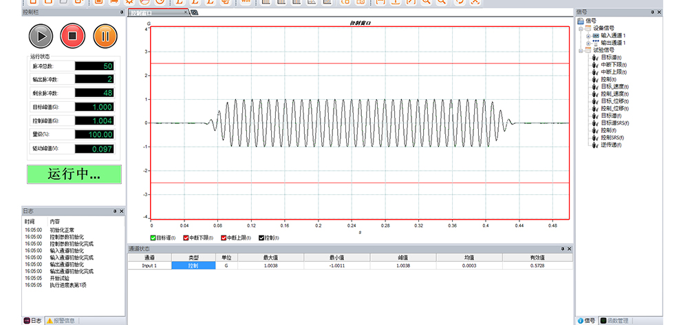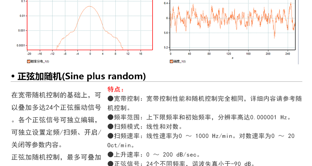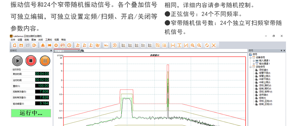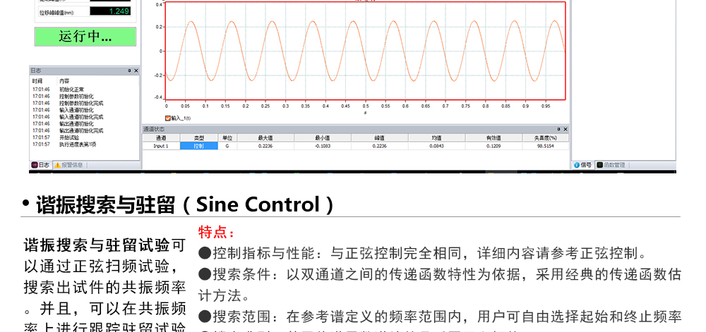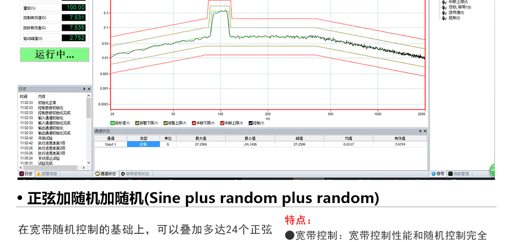 用途:正弦試驗可以控制振動臺實現定頻(駐留)、掃頻等振動試驗。控制算法中采用了跟蹤濾波的幅值以及相位檢測算法,可以實現對控制信號的準確反饋以及實時的閉環控制。