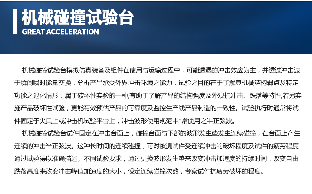 用途:機械碰撞試驗臺模擬仿真裝備及組件在使用與運輸過程中,可能遭遇的沖擊效應(yīng)為主,并透過沖擊波于瞬間瞬時能量交換,分析產(chǎn)品承受外界沖擊環(huán)境之能力,試驗之目的在于了解其機