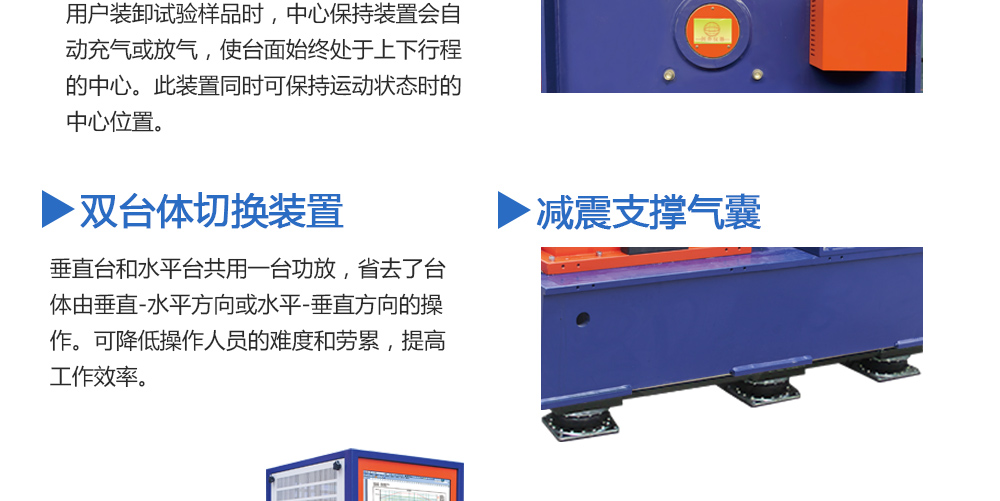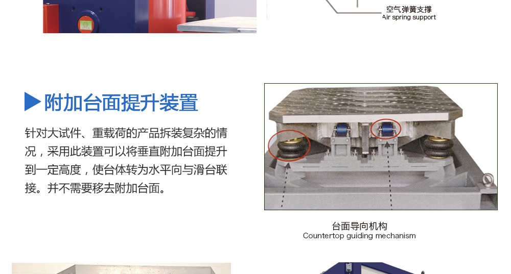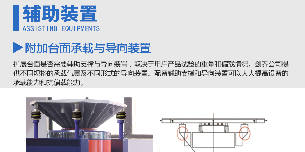 用途:擴展臺面是否需要輔助支撐與導向裝置,取決于用戶產品試驗的重量和偏載情況。劍喬公司提供不同規(guī)格的承載氣囊及不同形式的導向裝置。配備輔助支撐和導向裝置可以大大提高設備的承載能